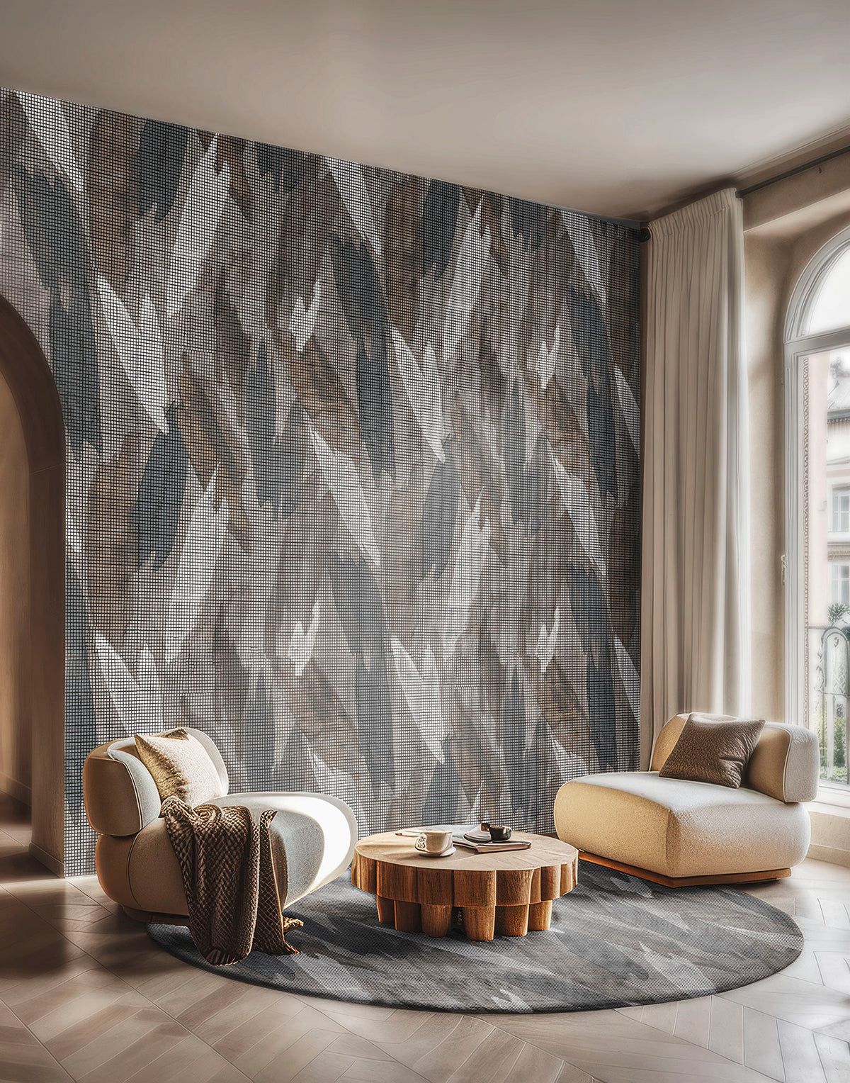 Tapeta doskonale sprawdzi się w nowoczesnych przestrzeniach mieszkalnych, takich jak salon, sypialnia czy gabinet, a także w eleganckich wnętrzach komercyjnych wymagających stylowej, artystycznej oprawy. Jej ponadczasowy design oraz wysoka jakość wykonania sprawiają, że stanowi idealny wybór dla osób poszukujących tapety premium, która łączy abstrakcyjną sztukę z subtelną fakturą.